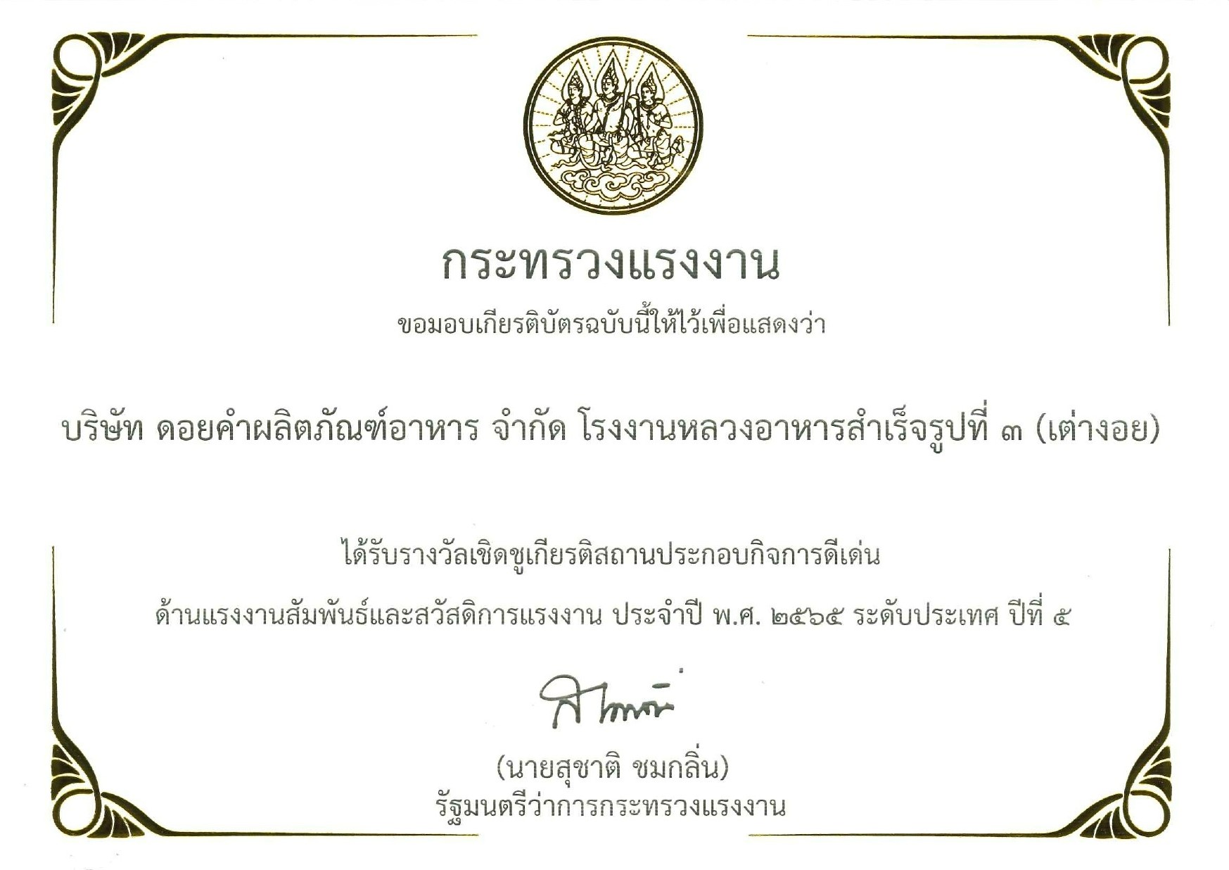 โรงงานหลวงอาหารสำเร็จรูปที่ 3 (เต่างอย) จังหวัดสกลนคร ได้รับรางวัลสถานประกอบกิจการดีเด่น ด้านแรงงานสัมพันธ์และสวัสดิการแรงงาน ประจำปี พ.ศ.2565 ระดับประเทศ ปีที่ 5