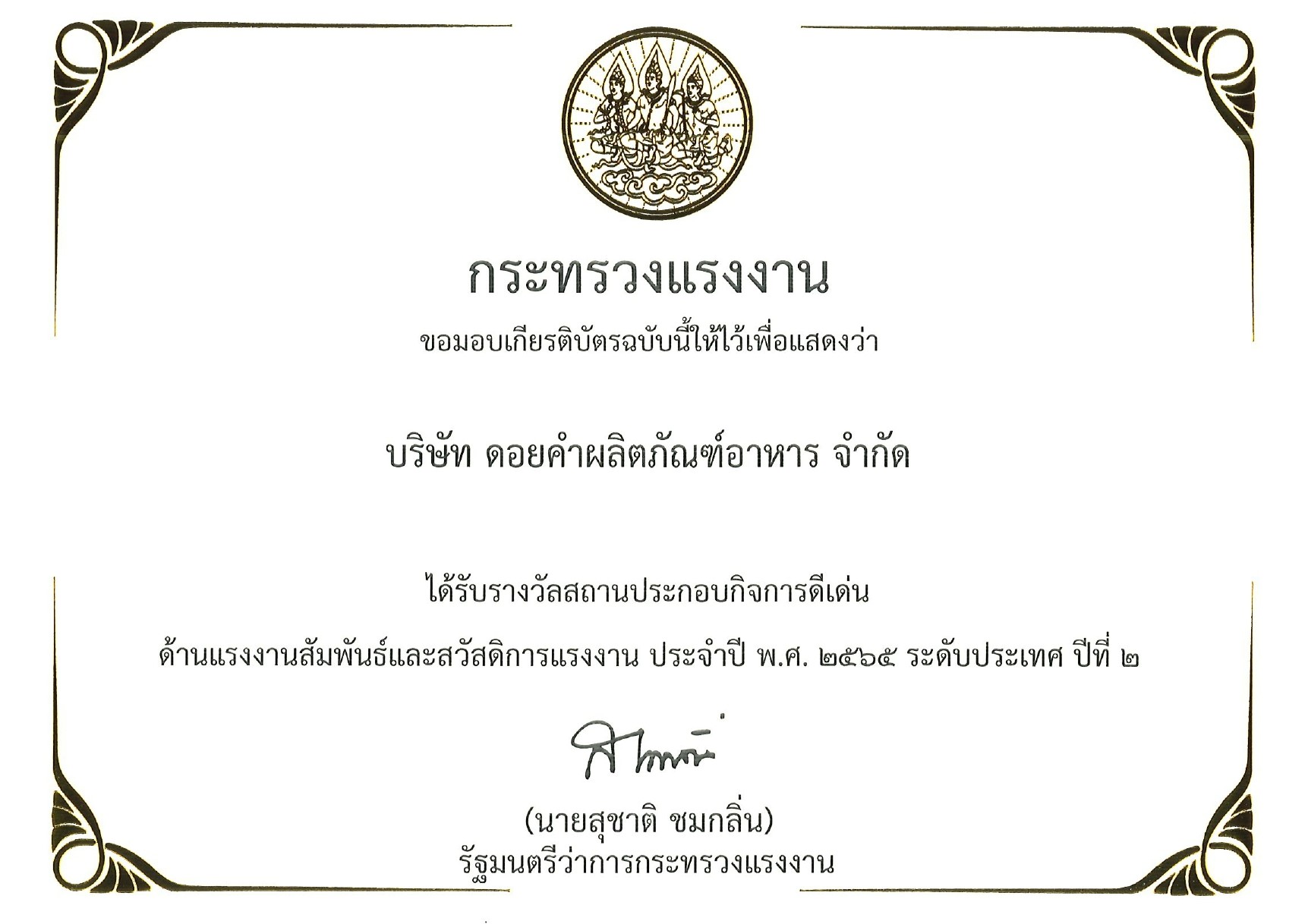 บริษัท ดอยคำผลิตภัณฑ์อาหาร จำกัด ได้รับรางวัลสถานประกอบกิจการดีเด่น ด้านแรงงานสัมพันธ์และสวัสดิการแรงงาน ประจำปี พ.ศ.2565 ระดับประเทศ ปีที่ 2