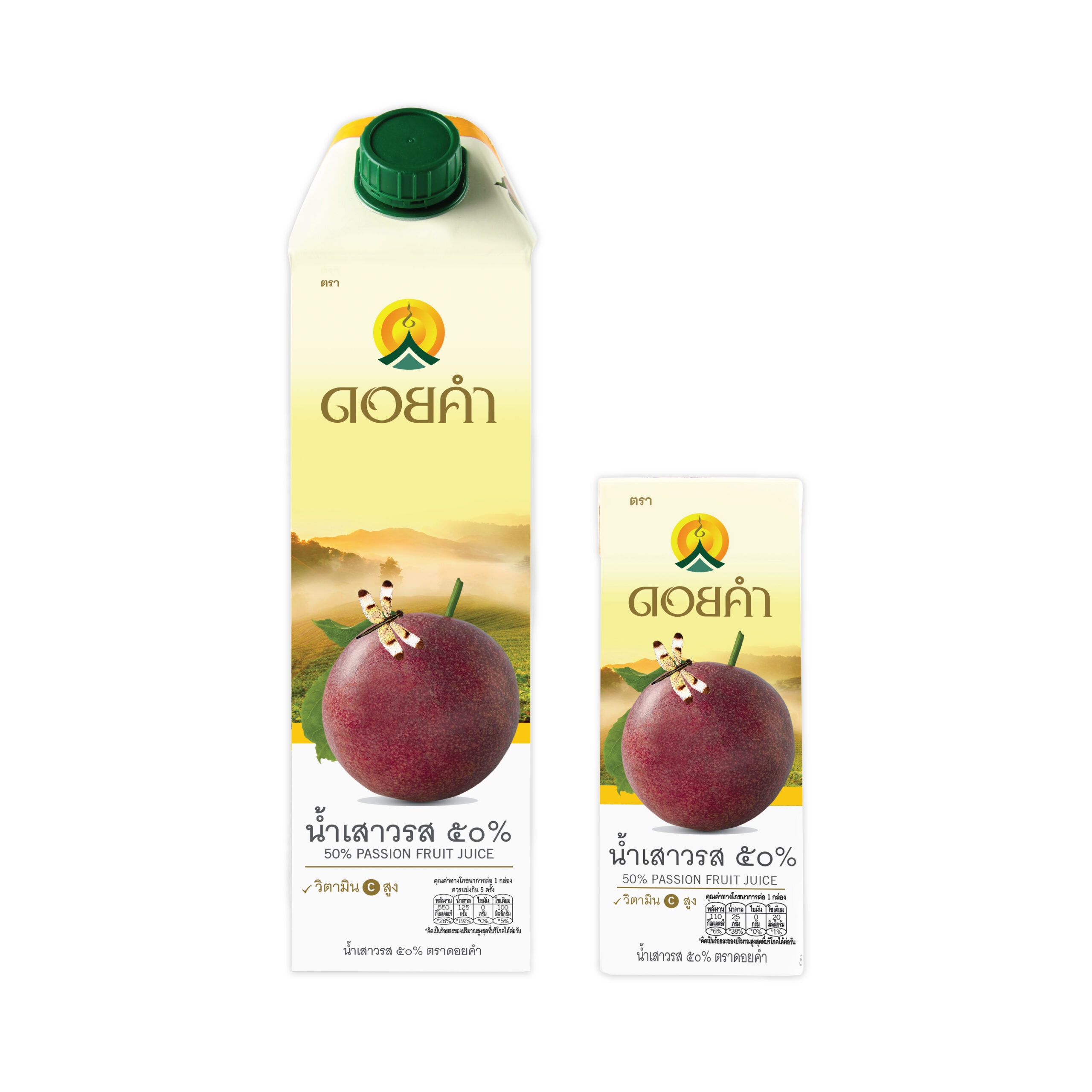 ที่สุดของน้ำผลไม้ที่มีรสชาติเปรี้ยวอมหวานและมีกลิ่นหอมอันเป็นเอกลักษณ์ของดอยคำ แหล่งวิตามินซีชั้นยอด ที่มาจากเสาวรสสดพันธุ์สีเหลือง และสีม่วง ผลผลิตจากการส่งเสริมเกษตร จังหวัดเชียงราย