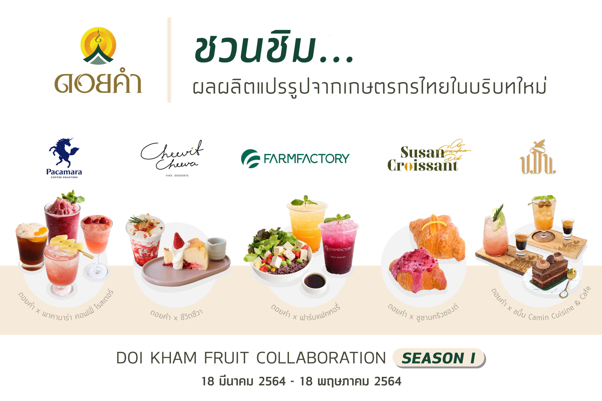 ครั้งแรกของดอยคำ ในความร่วมมือสร้างสรรค์เมนูอาหารและเครื่องดื่ม จากผลผลิตคุณภาพแปรรูปของเกษตรกรไทย หรือ “Doikham Fruit Collaboration” Season 1 ซึ่งครั้งนี้ ดอยคำได้รับความร่วมมือจากร้านอาหารและเครื่องดื่มยอดนิยมทั้ง 5 ร้าน ได้แก่