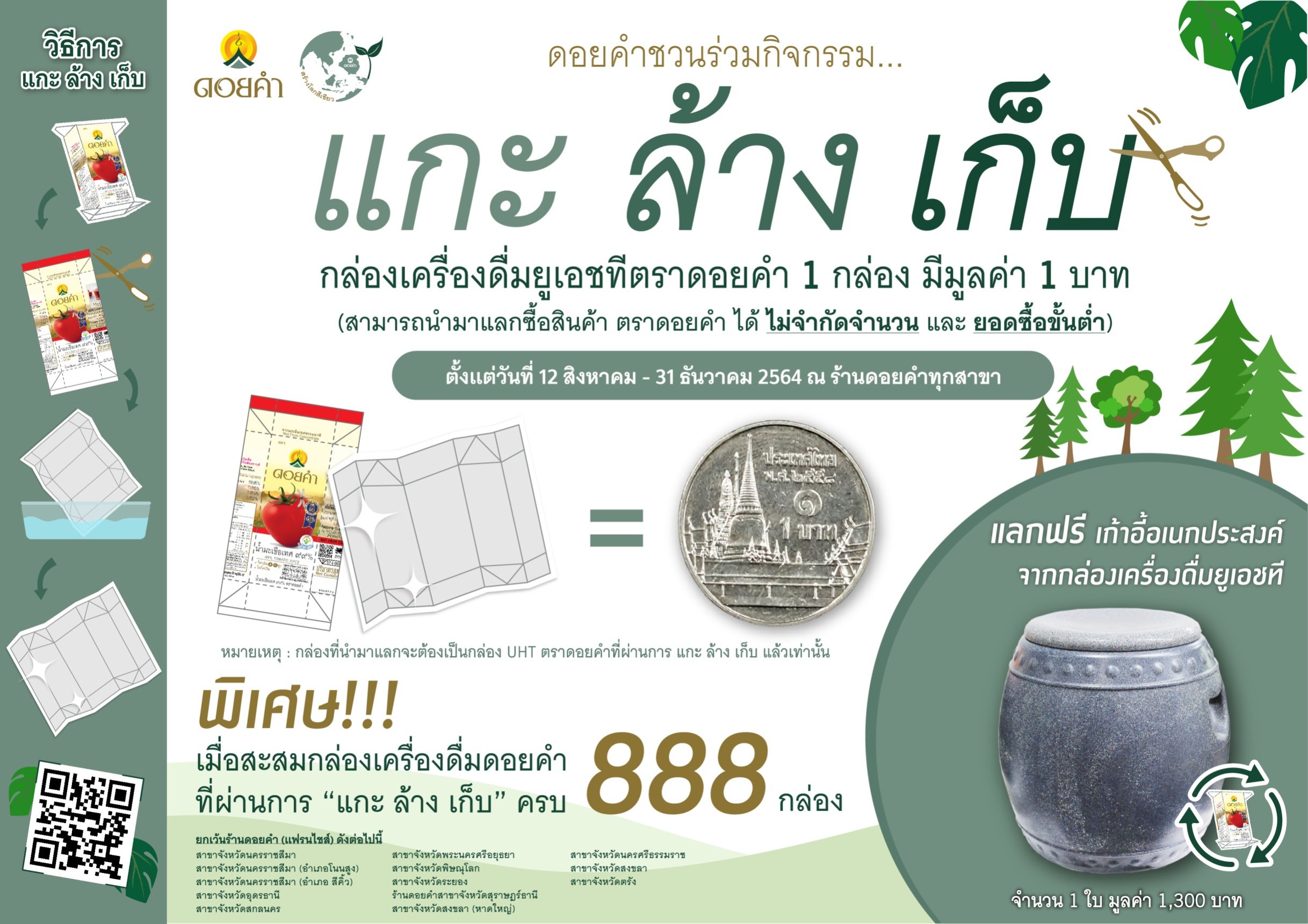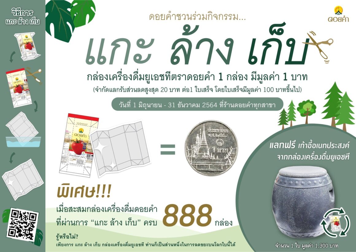 1.กล่องน้ำผลไม้และน้ำสมุนไพรพร้อมดื่ม ตราดอยคำที่ผ่านขบวนการ แกะ ล้าง เก็บ 1 กล่อง มีมูลค่า 1 บาท แลกรับส่วนลดแทนเงินสดโดยซื้อผลิตภัณฑ์ดอยคำ และเครื่องดื่มชงเท่านั้น ไม่จำกัดจำนวน (โดยไม่สามารถเปลี่ยนเป็นเงินสดได้)