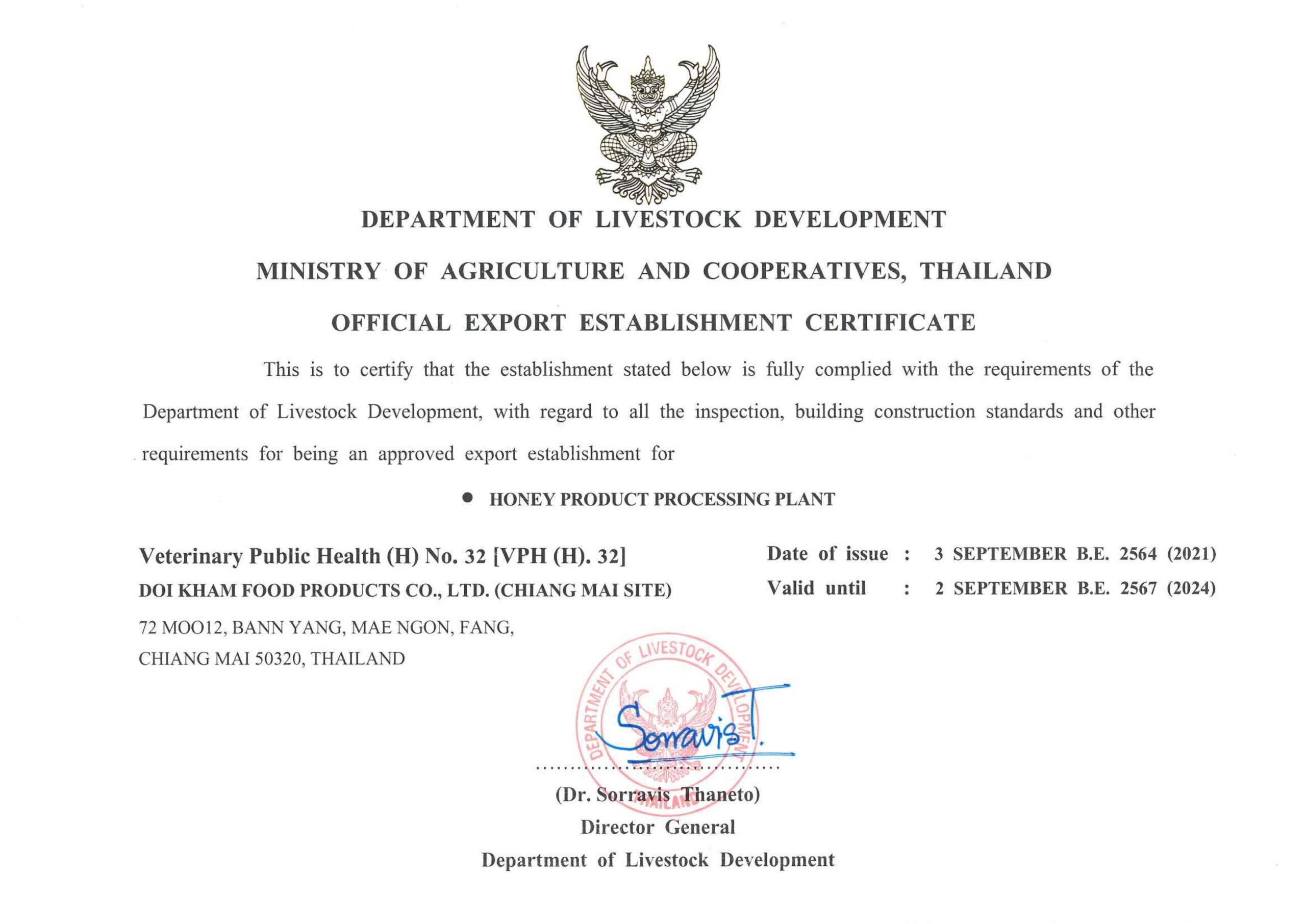 โรงงานหลวงอาหารสำเร็จรูปที่ 1 (ฝาง) จังหวัดเชียงใหม่ ได้รับการรับรองให้เป็นโรงงานเพื่อการส่งออกระบบ GMP (โรงงานใหม่) (OFFICIAL EXPORT ESTABLISHMENT CERTIFICATE) Veterinary Public Health (H) No.32 [VPH (H). 32] ในกลุ่มผลิตภัณฑ์ “น้ำผึ้งดอยคำ“ จากคณะกรรมการรับรองระบบ GMP และระบบ HACCP ในสถานประกอบการเพื่อการส่งออก จากสำนักพัฒนาระบบและรับรองมาตรฐานสินค้าปศุสัตว์ กรมปศุสัตว์