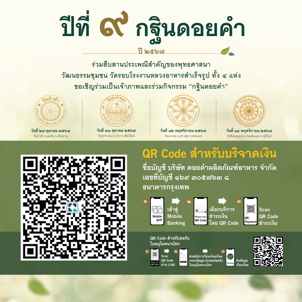 โดยท่านสามารถบริจาคได้โดยการโอนเข้าบัญชี บริษัท ดอยคำผลิตภัณฑ์อาหาร จำกัด ธนาคารกรุงเทพ สาขาสะพานผ่านฟ้า เลขที่บัญชี 1693057638 หรือบริจาคผ่านการสแกนคิวอาร์โค้ดจากสื่อประชาสัมพันธ์ทุกช่องทาง และร้านดอยคำทุกสาขา