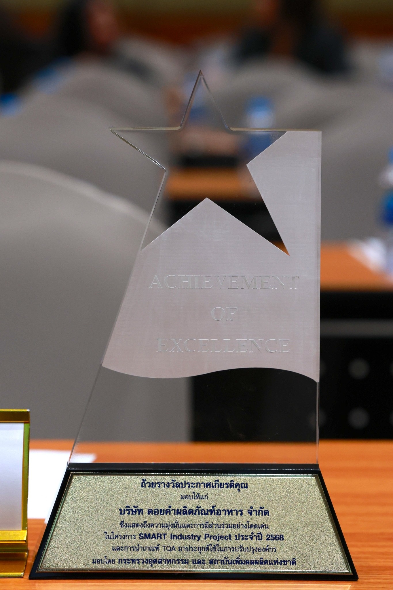 วันศุกร์ที่ 14 พฤศจิกายน พ.ศ. 2568 บริษัท ดอยคำผลิตภัณฑ์อาหาร จำกัด นำโดย นางชนันนัทธ์ พลปัถพี รองผู้จัดการใหญ่ (ด้านขายและการตลาด) พร้อมด้วย โครงการพิเศษ (ฉ) สำนักบริหารกลยุทธ์ เข้ารับถ้วยประกาศเกียรติคุณ Achievement of Excellence ในงานสัมมนา “Enhancing Industrial Competitiveness through Holistic Organizational Management” การบริหารจัดการองค์กรแบบองค์รวม เพื่อเพิ่มขีดความสามารถในการแข่งขันของภาคอุตสาหกรรม ภายใต้กิจกรรม SMART Industry Project ประจำปี 2568 ซึ่งจัดขึ้นโดย กระทรวงอุตสาหกรรม โดยสำนักงานรางวัลคุณภาพแห่งชาติ สถาบันเพิ่มผลผลิตแห่งชาติ ณ ห้องปาริชาติ โรงแรมโกลเด้น ทิวลิป ซอฟเฟอริน