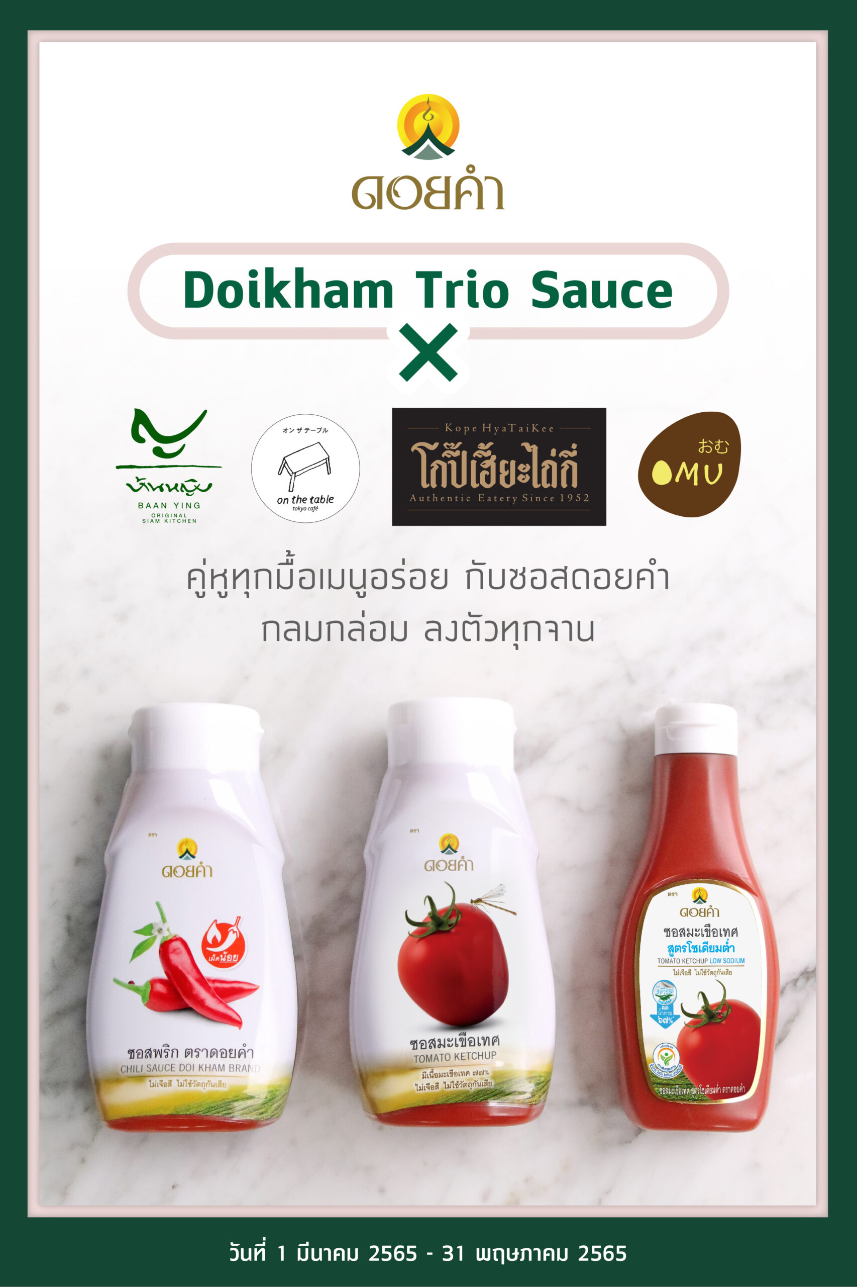 “ดอยคำ” ร่วมมือกับ 4 ร้านอาหารชั้นนำ ได้แก่ “On The Table” ร้านอาหารฟิวชันหลากหลายสไตล์ ใส่ใจสุขภาพ “บ้านหญิง” ร้านอาหารไทยที่มีชื่อเสียงตั้งแต่อดีตจนถึงปัจจุบัน “โกปี๊เฮี้ยะไถ่กี่” ร้านอาหารเช้าสุดคลาสสิกพัฒนาจากรุ่นสู่รุ่น และ “Omu” ร้านข้าวห่อไข่สุดละมุนเอกลักษณ์ในสไตล์ญี่ปุ่น ครั้งนี้ ดอยคำเลือกนำผลิตภัณฑ์ซอส 3 สูตร 3 สไตล์ มาแนะนำให้ทุกคนได้ลิ้มลอง ผ่านการเสิร์ฟคู่กับเมนูขายดี Signature ของแต่ละร้านดัง เหล่านักชิมสามารถเลือกเพิ่มอรรถรสได้ในแต่ละเมนูได้ตามใจชอบ ไม่ว่าจะเป็น รสเผ็ดหวานกำลังดี จากซอสพริกสูตรเผ็ดน้อย ผลิตจากพริกชี้ฟ้าคุณภาพดี หรือเพิ่มความอร่อย เข้มข้นกลมกล่อม จากซอสมะเขือเทศ เต็มเนื้อมะเขือเทศมากถึง 77% และสำหรับสายรักสุขภาพ ยังมีซอสมะเขือเทศ สูตรโซเดียมต่ำ จากการคัดสรรมะเขือเทศที่ระดับความสุก 70% ทำให้ได้ปริมาณโซเดียมต่ำตามธรรมชาติ รับรองคุณภาพผลิตภัณฑ์ด้วยความพิถีพิถันตั้งแต่การเลือกวัตถุดิบจากเกษตรกรไทย