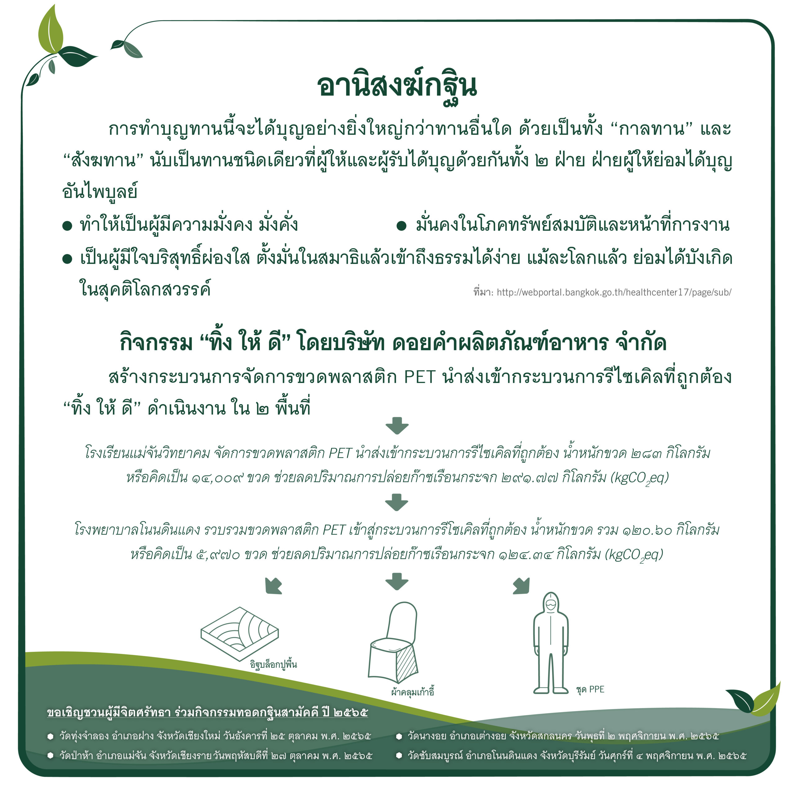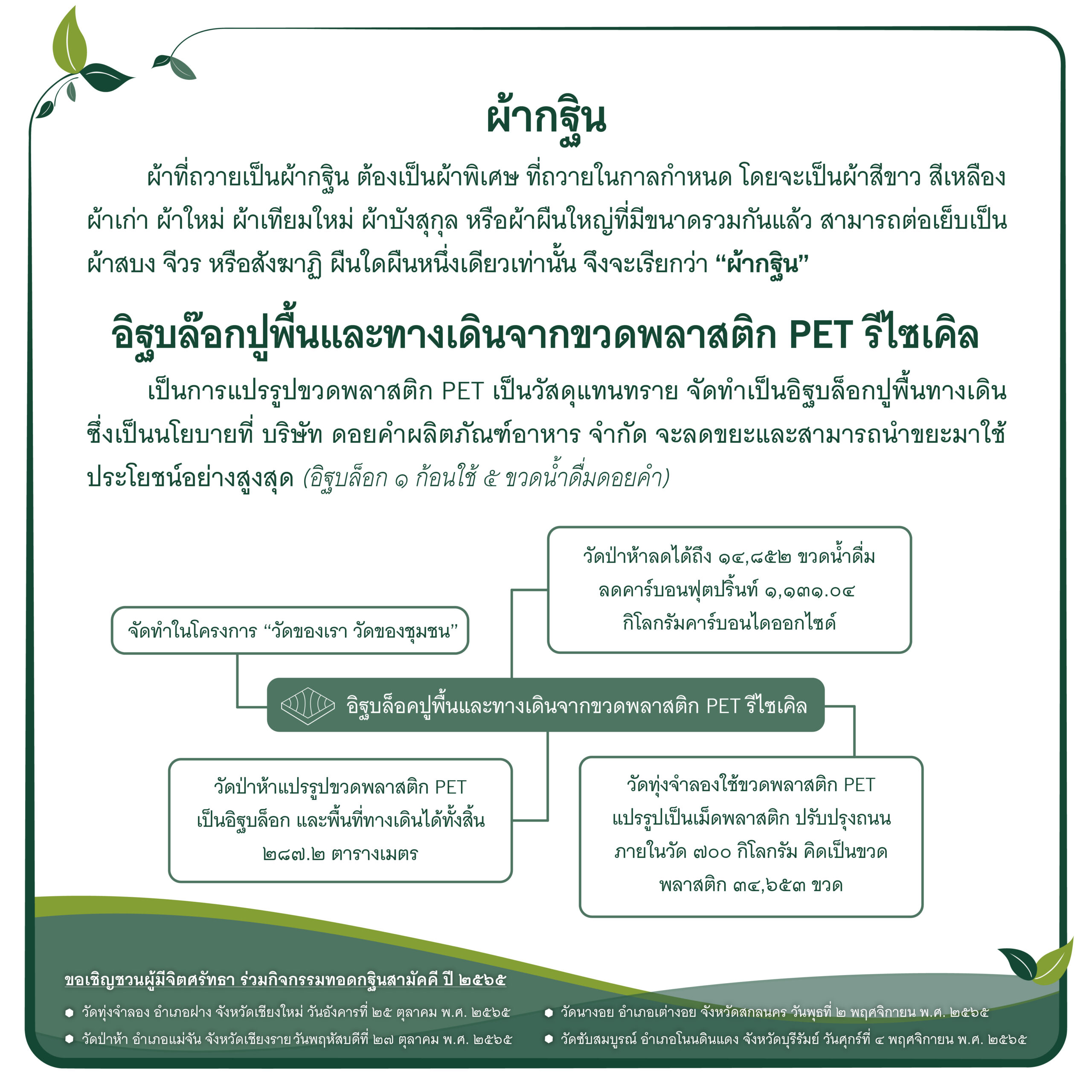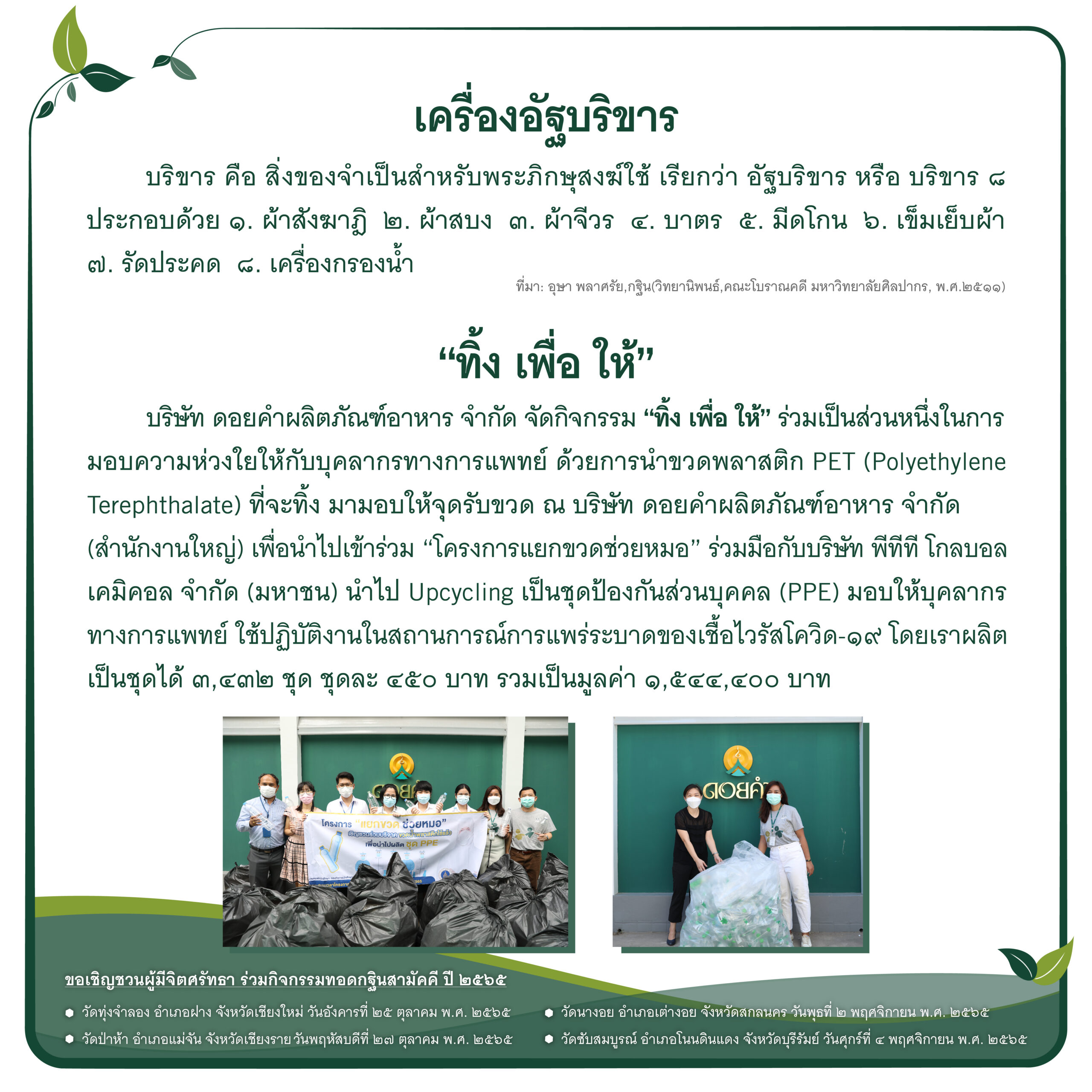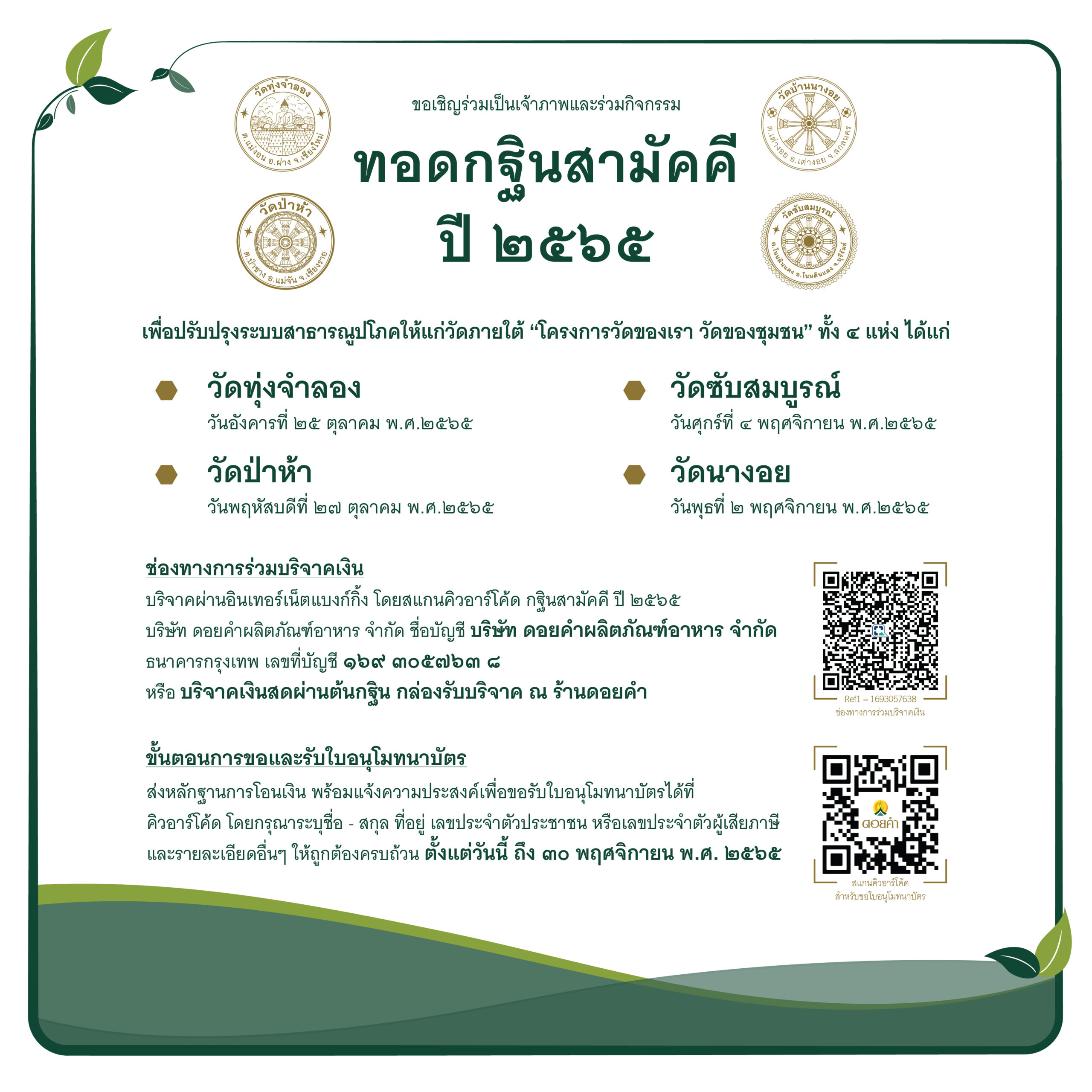 บริษัทฯ จึงขอเชิญทุกท่านร่วมกิจกรรม กฐินดอยคำ ประจำปี 2565 ภายใต้แนวคิด “กฐินและการเป็นมิตรกับสิ่งแวดล้อม” ผ่านการร่วมบริจาคเงิน เพื่อปรับปรุงสาธารณูปโภคให้แก่วัด ทั้ง 4 แห่ง ได้แก่