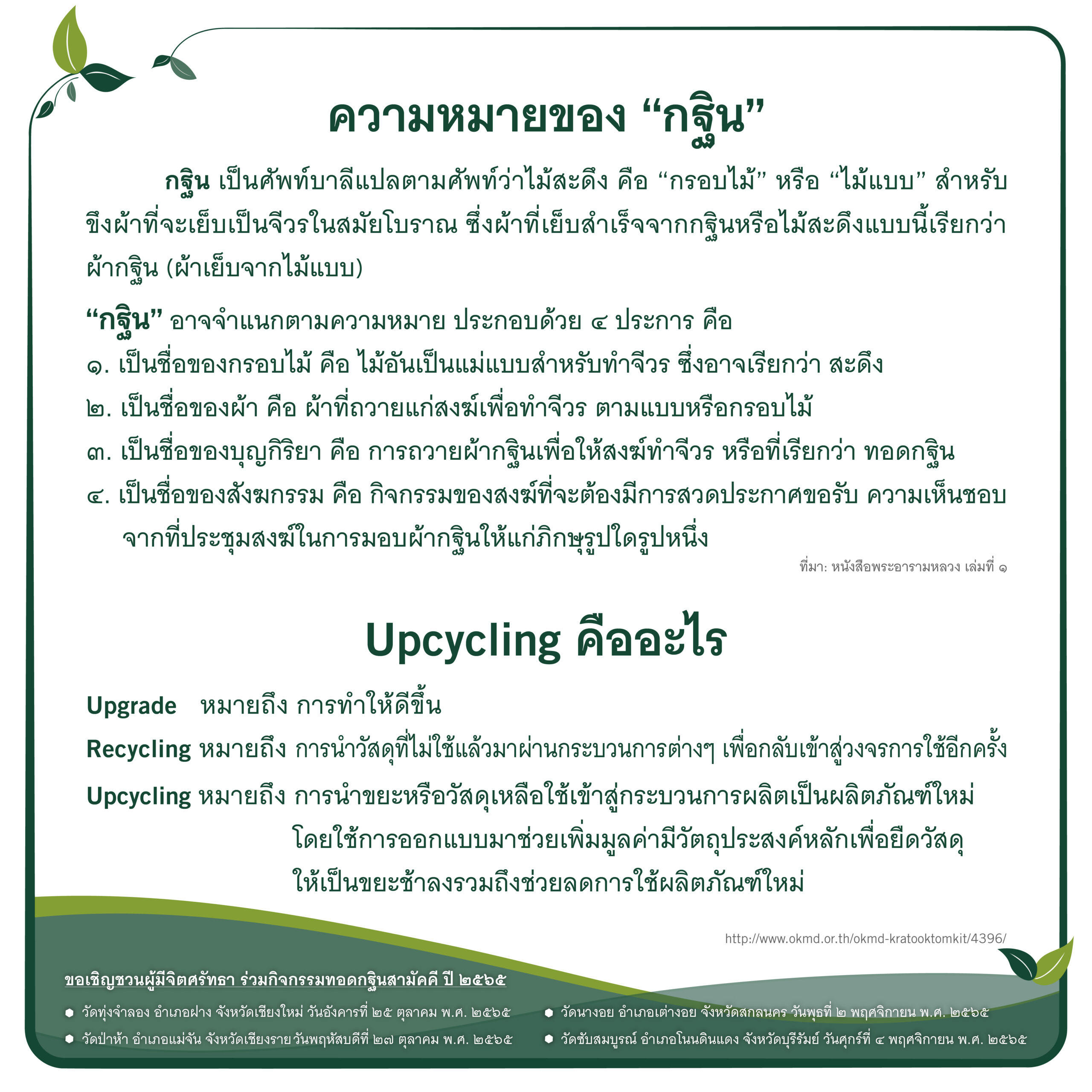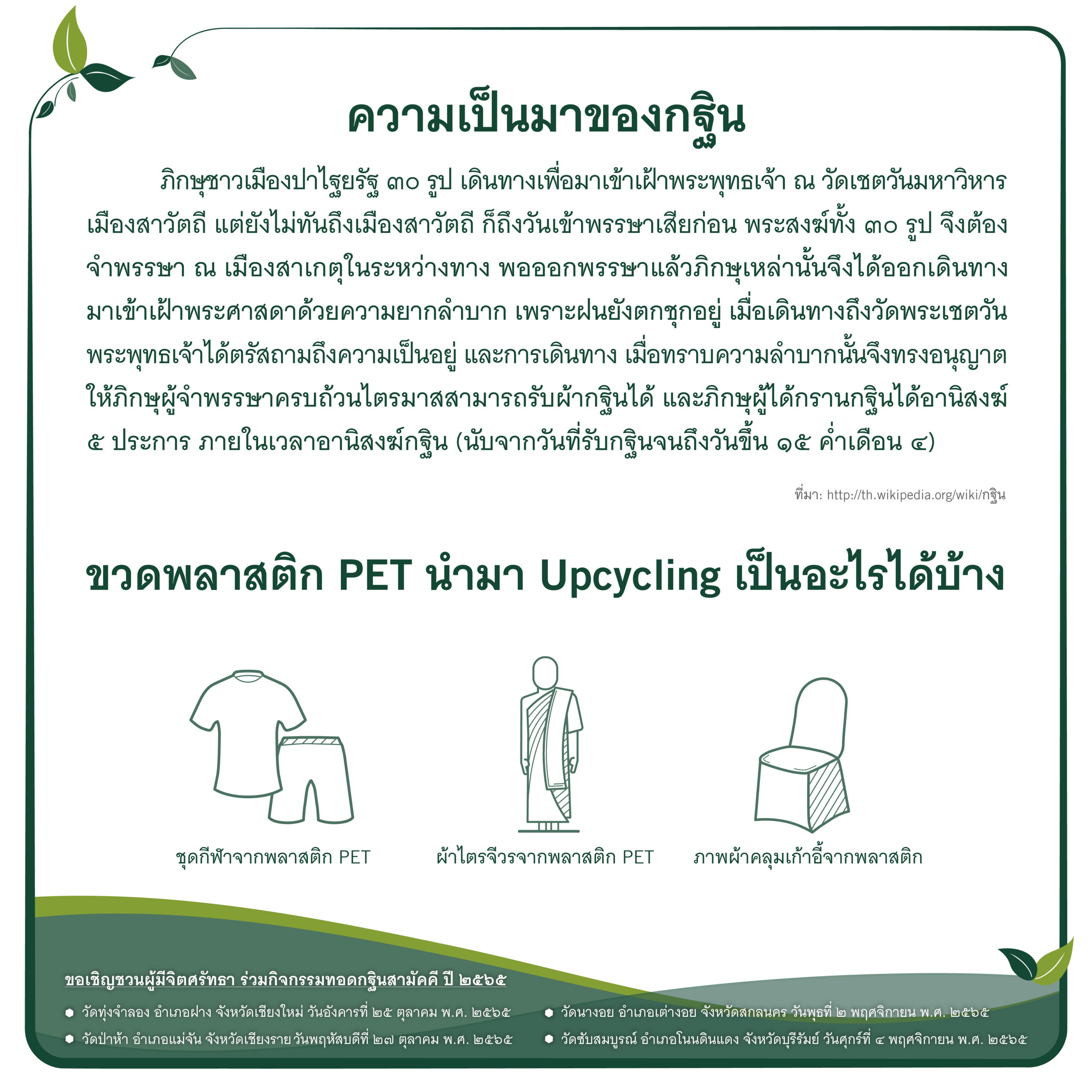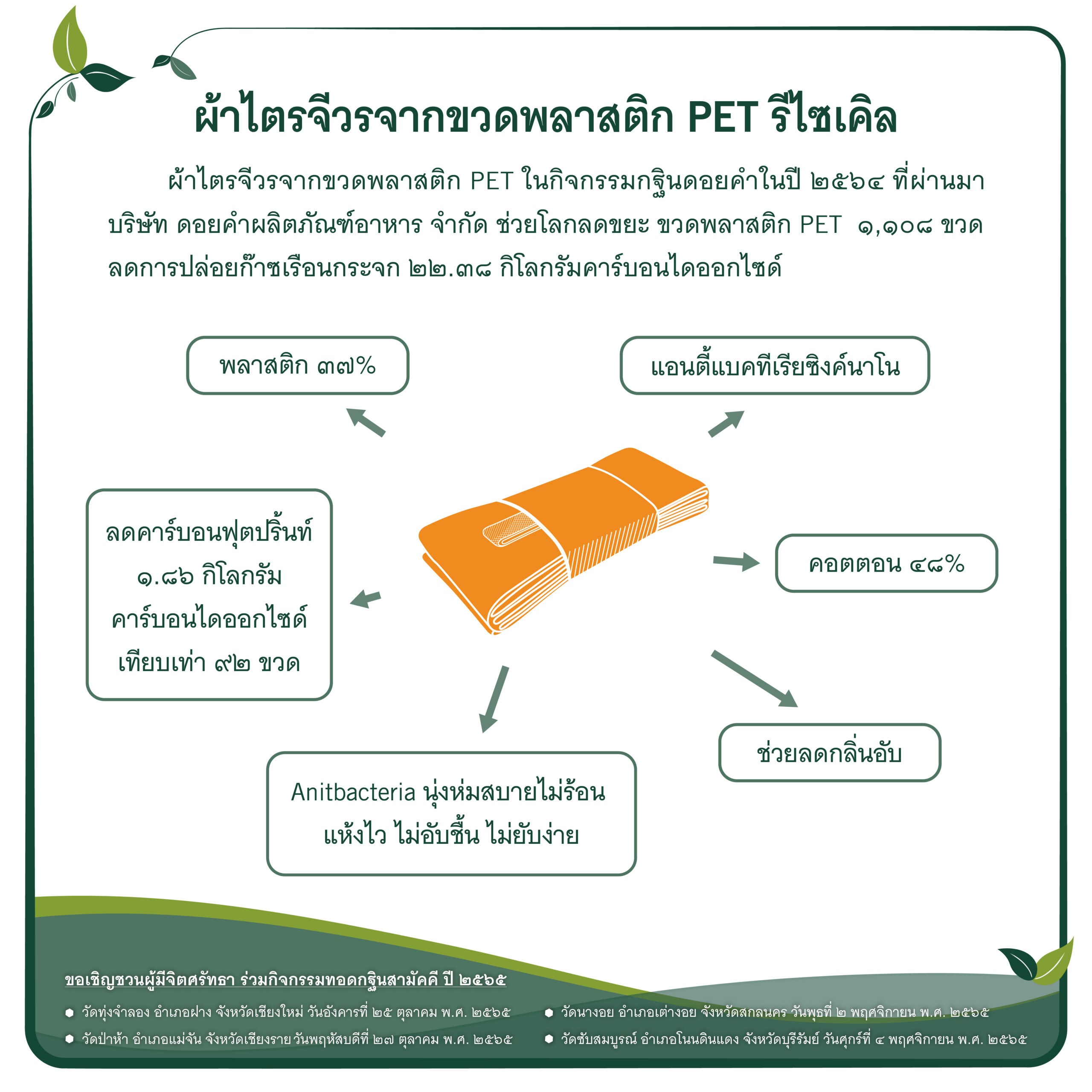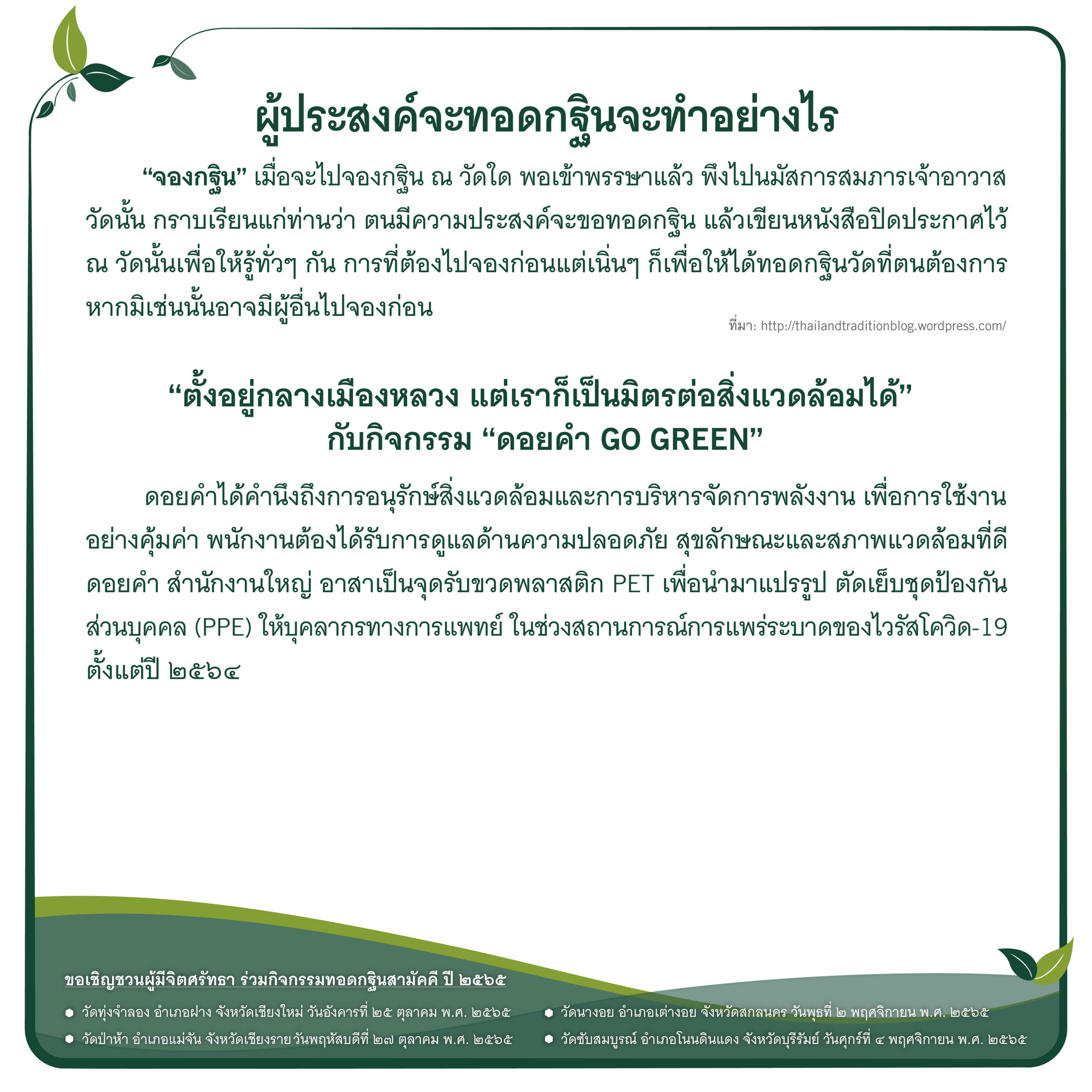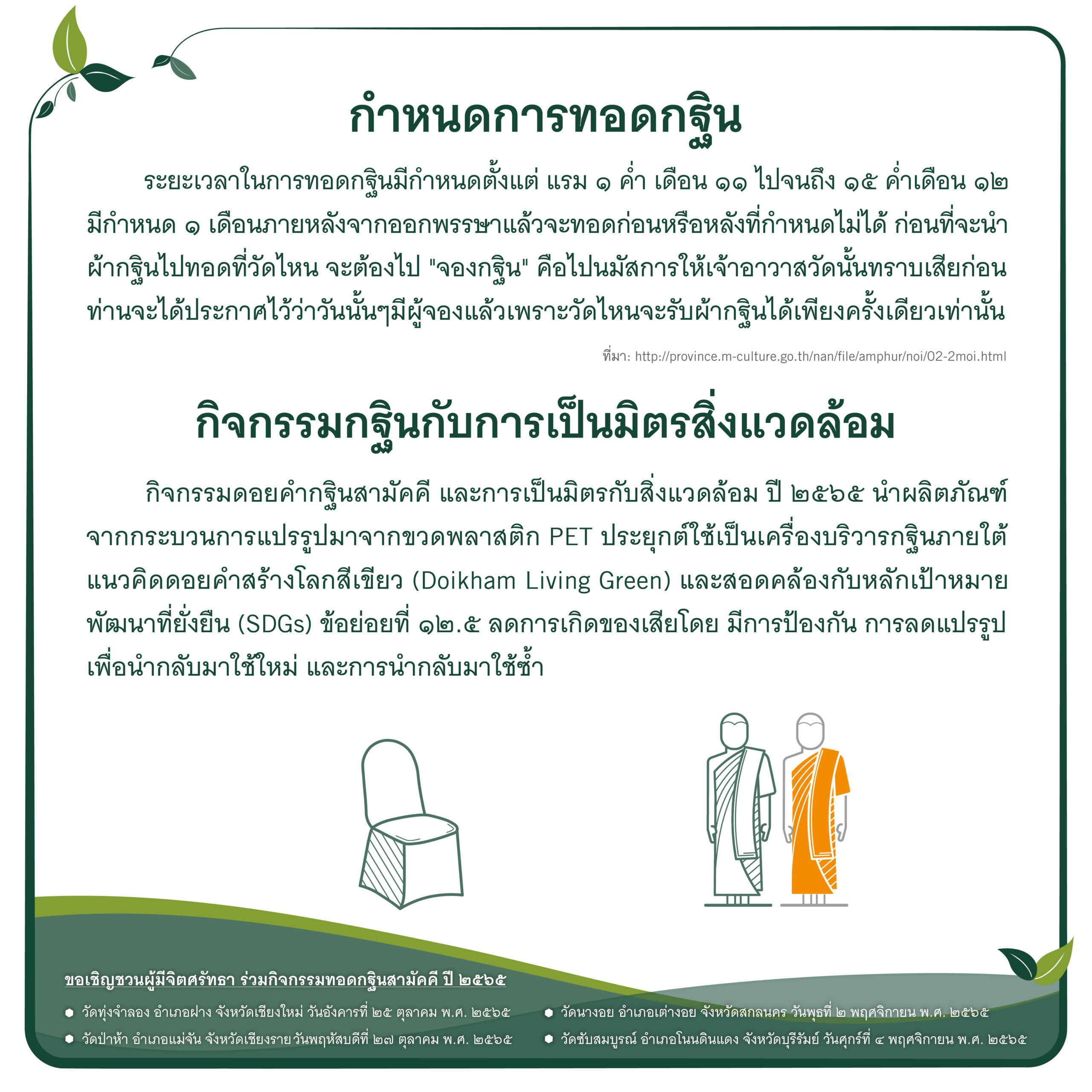 บริษัทฯ จึงขอเชิญทุกท่านร่วมกิจกรรม กฐินดอยคำ ประจำปี 2565 ภายใต้แนวคิด “กฐินและการเป็นมิตรกับสิ่งแวดล้อม” ผ่านการร่วมบริจาคเงิน เพื่อปรับปรุงสาธารณูปโภคให้แก่วัด ทั้ง 4 แห่ง ได้แก่