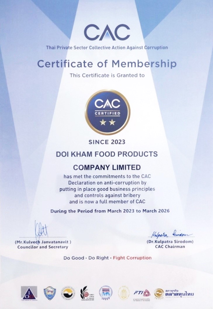 บริษัท ดอยคำผลิตภัณฑ์อาหาร จำกัด นำโดย นายพิพัฒพงศ์ อิศรเสนา ณ อยุธยา กรรมการผู้จัดการใหญ่ ได้รับการรับรองเป็นสมาชิกของโครงการแนวร่วมปฏิบัติของภาคเอกชนไทยในการต่อต้านการทุจริต หรือ CAC (Thai Private Sector Collective Action Against Corruption) ในงาน CAC National Conference 2023 ภายใต้หัวข้อ “Public-Private Collaboration: A Strong Collective Action Against Corruption ผนึกกำลังไตรภาคี สร้างความแข็งแกร่ง เพื่อความยั่งยืน” จาก แนวร่วมต่อต้าน คอร์รัปชันของภาคเอกชนไทย (CAC)