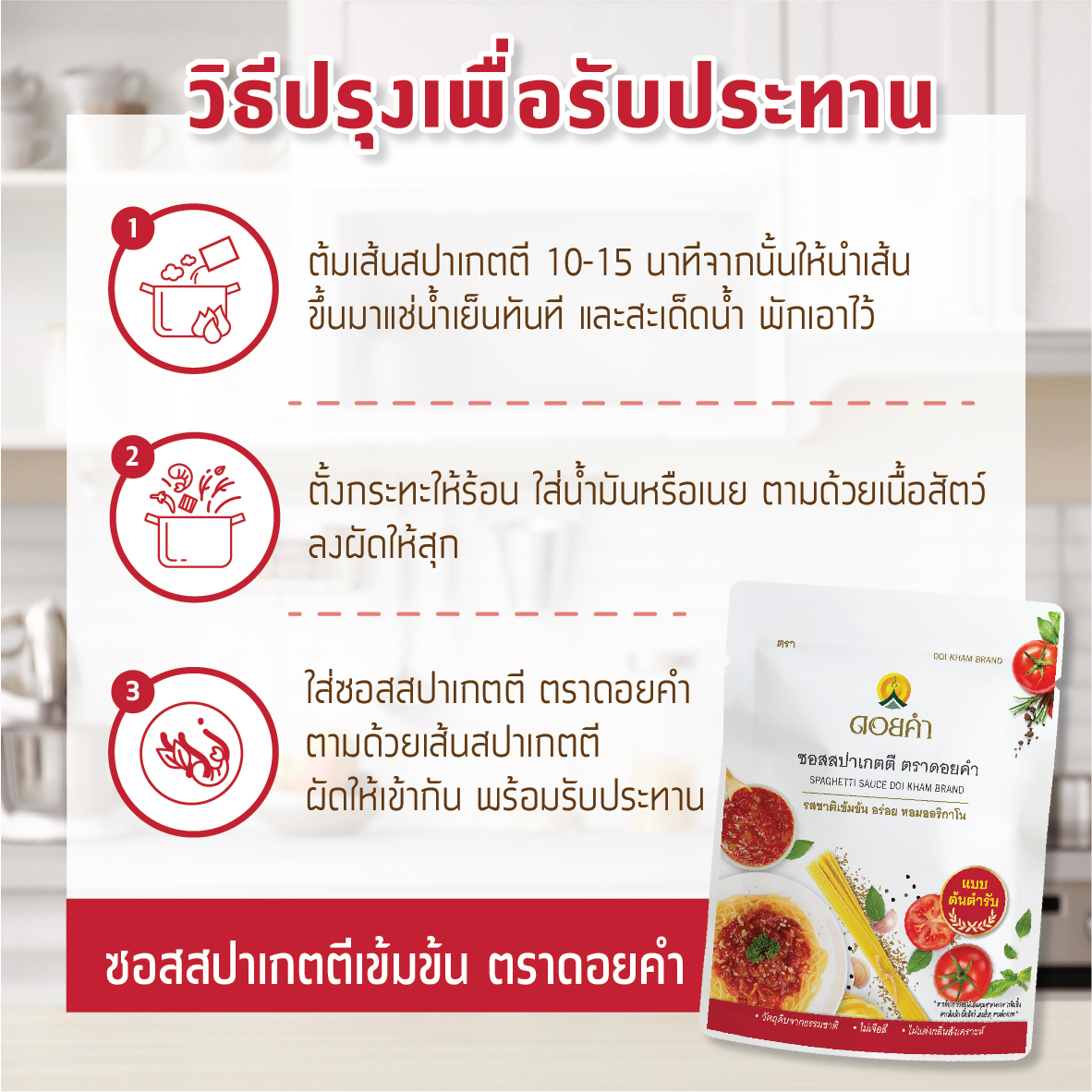 - ใส่ซอสสปาเกตตี ตราดอยคำ ตามด้วยเส้นสปาเกตตี ผัดให้เข้ากัน พร้อมรับประทาน