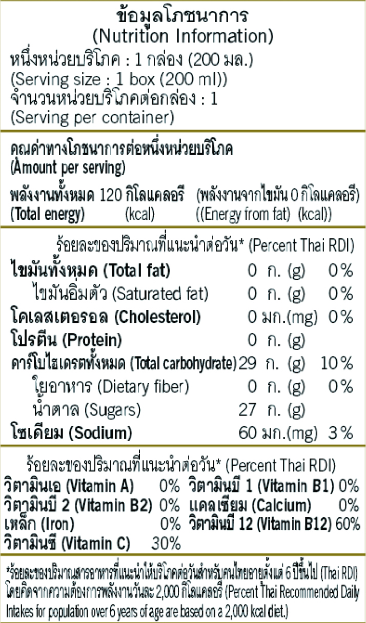 คำแนะนำ (ข้อควรระวัง): แช่เย็นและเขย่ากล่องก่อนดื่ม เพื่อรสชาติที่ดียิ่งขึ้น