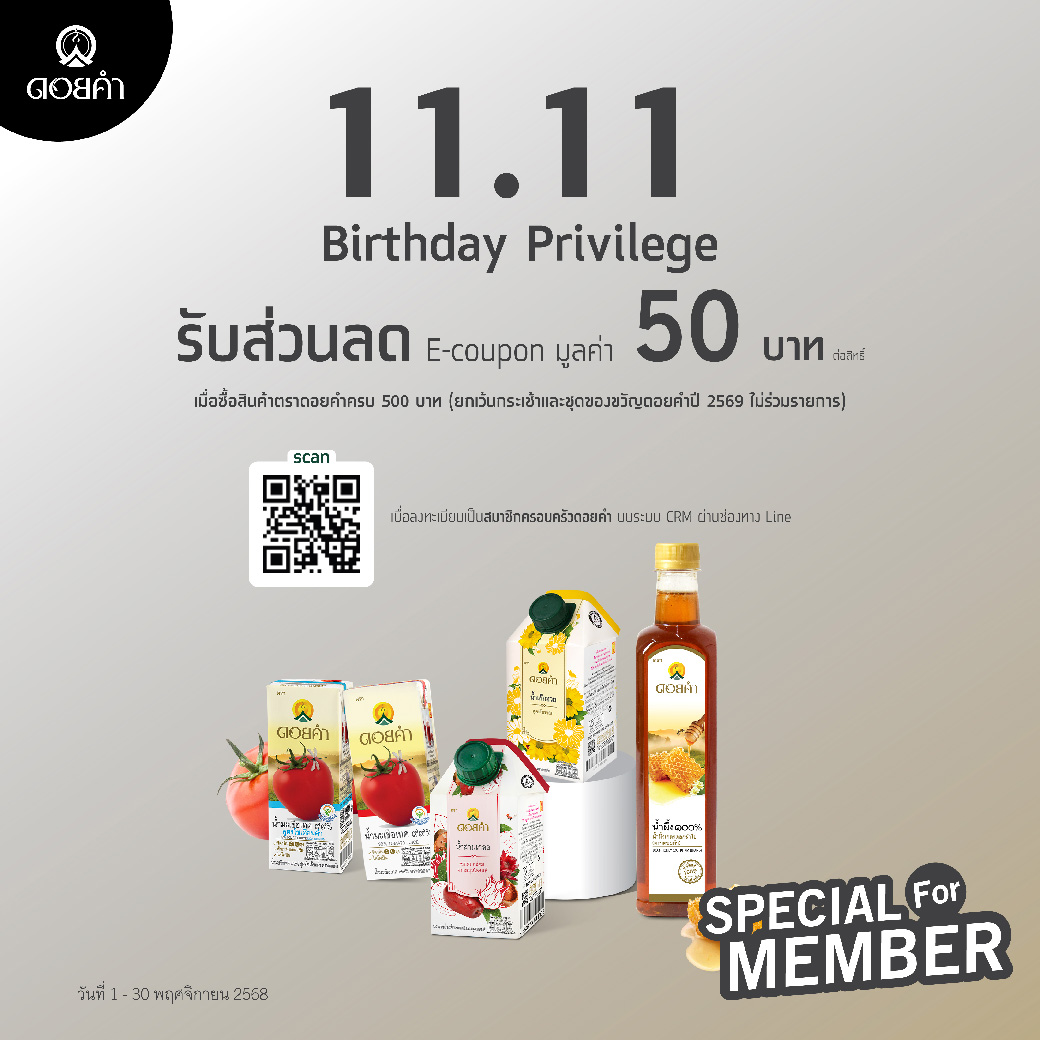 ♦ สิทธิพิเศษสำหรับลูกค้าสมาชิกที่เกิดวันที่ 11 พฤศจิกายน รับ E-Coupon มูลค่า 50 บาท/สิทธิ์