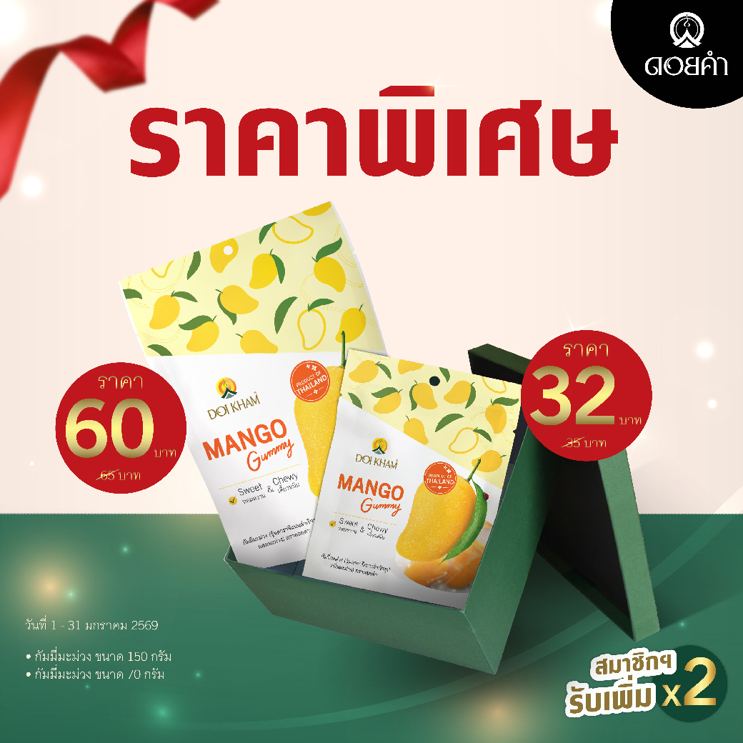 - กัมมี่มะม่วง ขนาด 70 กรัม ราคาพิเศษซองละ 32 บาท (ราคาปกติซองละ 35 บาท)